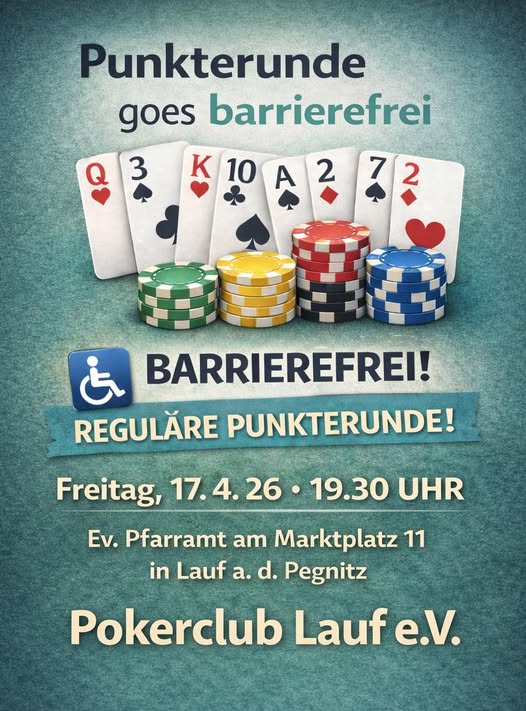Am Freitag, 17. April 2026, findet unsere Punkterunde nicht wie gewohnt im Vereinslokal statt, sondern im Ev. Pfarramt Am Marktplatz 1 in Lauf an der Pegnitz.